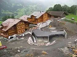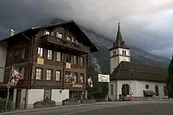 The first village church was a wooden building from the mid-12th century. The wooden building was replaced with the stone St. Mary's Church in 1180. This church was replaced in the 16th century, and the present church was built in 1793.[2] On August 18, 1892, a large part of the village was destroyed by a fire. That day, which followed a drought period, a violent foehn storm was raging. Within two hours, 116 buildings in the Grindelwald valley were destroyed and 412 residents became homeless.[4]