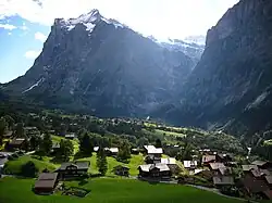 The municipality is quite large and is divided into seven mountain communities. However the municipality is dominated by the large tourist center of Grindelwald, slightly above the Black Lütschine, the main river of the valley, the latter converging with the White Lütschine. The village is surrounded by the mountains of the Faulhorn, Schwarzhorn, Wellhorn, Wetterhorn, Mettenberg, Schreckhorn, Lauteraarhorn, Agassizhorn, Fiescherhorn, Mönch (the highest), Eiger, Lauberhorn and Männlichen, all of which are either within or on the border of the municipality. The Kleine Scheidegg and the Grosse Scheidegg, respectively "minor watershed" and "major watershed" are the two main passes of the valley.[7]