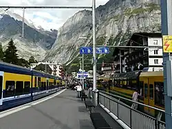 Grindelwald railway station, in the centre of Grindelwald village, is served by trains of the Berner Oberland Bahn (BOB), which run to Interlaken, and by trains of the Wengernalpbahn (WAB), which run to Kleine Scheidegg and on to Wengen and Lauterbrunnen. At Kleine Scheidegg, a connection can be made with the Jungfraubahn, which ascends inside the Eiger to the Jungfraujoch.[7]
