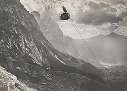 The Grindelwald road was built in 1860–72, and the Bernese Oberland railway reached the village in 1890, both of which transformed an arduous journey into a simple trip and allowed tourists to flood into the village. In 1888, Grindelwald was the first resort in the Bernese Oberland to also become a winter destination, attractions being sleigh rides, curling, skating and, from 1891, skiing. The first resort opened in 1888, there were 10 hotels in 1889, and by 1914 there were 33 in Grindelwald. A rack railway was built to Kleine Scheidegg in 1893, and it was expanded to the Jungfraujoch in 1912. Numerous ski lifts, cable cars, hiking trails and alpine huts were built in the late 19th and 20th centuries to allow tourists to explore the mountains, notably the Wetterhorn Elevator, one of the first modern aerial tramways. Today, almost the entire economy of Grindelwald is based on tourism.[2] The V-cableway, inaugurated in 2020, is the last major development in the valley.
