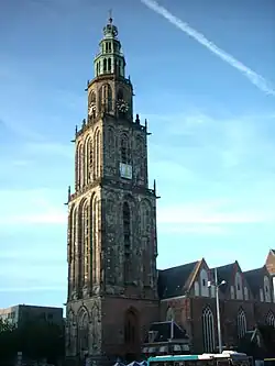 In the 13th century Groningen was an important trade centre and its inhabitants built a city wall to underline its authority.[27] The city had a strong influence on its surrounding lands and the Gronings dialect became common.[28] The city's most influential period was at the end of the 15th century, when the nearby province of Friesland was administered from Groningen.[29] During these years the Martinitoren was built which is considered to be the city's most significant landmark.[30]