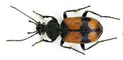 Although their body shapes and coloring vary somewhat, most are shiny black or metallic and have ridged wing covers (elytra). The elytra are fused in some species, particularly the large Carabinae, rendering the beetles unable to fly. The species Mormolyce phyllodes is known as violin beetle due to their peculiarly shaped elytra. All carabids except the quite primitive flanged bombardier beetles (Paussinae) have a groove on their fore leg tibiae bearing a comb of hairs used for cleaning their antennae.[5]
