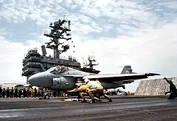 During the Gulf War in 1991, U.S. Navy and U.S. Marine Corps A-6s flew more than 4,700 combat sorties, providing close air support, destroying enemy air defenses, attacking Iraqi naval units, and hitting strategic targets. They were also the U.S. Navy's primary strike platform for delivering laser-guided bombs.[28] The U.S. Navy operated them from the aircraft carriers USS Saratoga, USS John F. Kennedy, USS Midway, USS Ranger, USS America and USS Theodore Roosevelt, while U.S. Marine Corps A-6s operated ashore, primarily from Shaikh Isa Air Base in Bahrain. Three A-6s were shot down in combat by SAMs and AAA.[29]