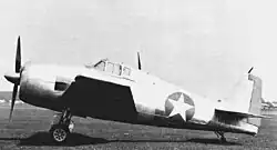 Grumman had been working on a successor to the F4F Wildcat since 1938, and the contract for the prototype XF6F-1 was signed on 30 June 1941. The aircraft was originally designed to use the Wright R-2600 Twin Cyclone two-row, 14-cylinder radial engine of 1,700 hp (1,300 kW) (the same engine used with Grumman's then-new torpedo bomber under development), driving a three-bladed Curtiss Electric propeller.[11] Instead of the Wildcat's narrow-track, hand-cranked, main landing gear retracting into the fuselage inherited from the F3F ( a design from the 1930s Grumman FF-1 fighter biplane), the Hellcat had wide-set, hydraulically actuated landing-gear struts that rotated through 90° while retracting backwards into the wings, but with full wheel doors fitted to the struts that covered the entire strut and the upper half of the main wheel when retracted, and twisted with the main gear struts through 90° during retraction.[12] The wing was mounted lower on the fuselage and was able to be hydraulically or manually folded, with each panel outboard of the undercarriage bay folding backwards from pivoting on a specially oriented, Grumman-patented "Sto-Wing" diagonal axis pivoting system much like the earlier F4F, with a folded stowage position parallel to the fuselage with the leading edges pointing diagonally down.[13]