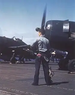 The U.S. Navy greatly preferred the more docile flight characteristics of the F6F over the Vought F4U Corsair, despite the Corsair's superior speed. This preference was particularly evident during carrier landings, which were a critical requirement for the Navy's success. Consequently, the Navy transferred the Corsair to the Marine Corps, which, not having to worry about carrier landings, utilized the Corsair for land-based sorties. The Hellcat remained the standard carrier-borne fighter for the U.S. Navy until the F4U series was finally cleared for U.S. carrier operations in late 1944. By that time, the carrier landing issues had largely been resolved, thanks in part to the Royal Navy Fleet Air Arm's use of the Corsair, which began in 1943.[38] In addition to its good flight qualities, the Hellcat was easy to maintain and had an airframe tough enough to withstand the rigors of routine carrier operations.[39] Like the Wildcat, the Hellcat was designed for ease of manufacturing and ability to withstand significant damage.