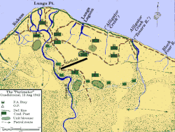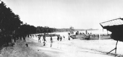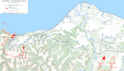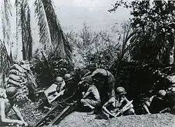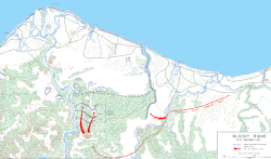 Allied troops suffered from a severe strain of dysentery soon after the landings, with one in five Marines afflicted by mid-August.[53] Although some of the Korean construction workers surrendered to the Marines, most of the remaining Japanese and Korean personnel gathered just west of the Lunga perimeter on the west bank of the Matanikau River and subsisted mainly on coconuts. A Japanese naval outpost was also located at Taivu Point, about 35 kilometers (22 mi) east of the Lunga perimeter. On 8 August, a Japanese destroyer from Rabaul delivered 113 naval reinforcement troops to the Matanikau position.[54]