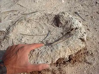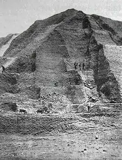 By the late 1860s, it became apparent that Peru's most productive guano site, the Chincha Islands, was nearing depletion. This caused guano mining to shift to other islands farther north and south. Despite this near exhaustion, Peru achieved its greatest ever export of guano in 1870 at more than 700,000 tonnes (770,000 short tons).[22] Concern of exhaustion was ameliorated by the discovery of a new Peruvian resource: sodium nitrate, also called Chile saltpetre. After 1870, the use of Peruvian guano as a fertiliser was eclipsed by Chile saltpetre in the form of caliche (a sedimentary rock) extraction from the interior of the Atacama Desert, close to the guano areas.[23]
