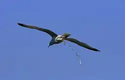 A herring gull (Larus argentatus) excreting waste near Île-de-Bréhat.