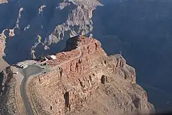 Aerial view of Guano Point. Old tramway headhouse is at the end of dirt road (right). Second tramway tower is more clearly visible, on skyline to right. Bat Cave mine is 760 m (2,500 ft) below, across the canyon.