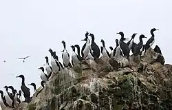 The word "guano" originates from the Andean language Quechua, in which it refers to any form of dung used as an agricultural fertiliser.[7] Archaeological evidence suggests that Andean people collected seabird guano from small islands and points off the desert coast of Peru for use as a soil amendment for well over 1,500 years,[8] and perhaps as long as 5,000 years.[9] Spanish colonial documents suggest that the rulers of the Inca Empire greatly valued guano, restricted access to it, and punished any disturbance of the birds with death.[9] The guanay cormorant is historically the most abundant and important producer of guano.[10] Other important guano-producing bird species off the coast of Peru are the Peruvian pelican and the Peruvian booby.[11]
