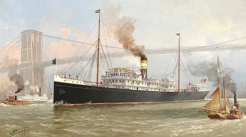 In 1899, Marconi sailed to the United States at the invitation of The New York Herald newspaper to cover that year's America's Cup international yacht races off Sandy Hook, New Jersey. His first demonstration was a transmission from aboard the SS Ponce, a passenger ship of the Porto Rico Line.[50] Marconi left for England on 8 November 1899 on the American Line's SS Saint Paul, and he and his assistants installed wireless equipment aboard during the voyage. Marconi's wireless brought news of the Second Boer War, which had begun a month before their departure, to passengers at the request of "some of the officials of the American line."[51] On 15 November the SS Saint Paul became the first ocean liner to report her imminent return to Great Britain by wireless when Marconi's Royal Needles Hotel radio station contacted her 66 nautical miles off the English coast. The first Transatlantic Times, a newspaper containing wireless transmission news from the Needles Station at the Isle of Wight, was published on board the SS Saint Paul before its arrival.[52]