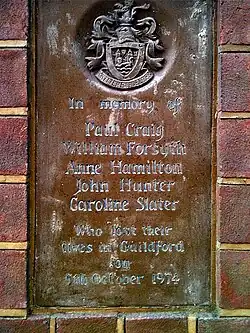On the evening of 5 October 1974, the Provisional Irish Republican Army detonated two gelignite bombs at two pubs in the town. The venues are thought to have been chosen as they were popular with off-duty military personnel from Aldershot Garrison. The first bomb exploded at the Horse and Groom in North Street at 8:50 pm, killing two members of the Scots Guards, two members of the Women's Royal Army Corps and one civilian. The second exploded around 35 minutes later at the Seven Stars in Swan Lane, injuring six members of staff and one customer.[122][123]