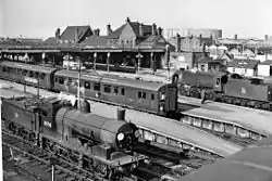 The first railway to be constructed in Surrey was the London to Southampton line, which opened in stages from May 1838.[79][80] Woking railway station,[note 15] was built on the south side of the tracks for the convenience of those travelling by stagecoach from Guildford and quickly became the railhead for the western half of the county.[81] Guildford railway station opened in 1845 as the terminus of a branch from Woking. Four years later, the line was extended to Godalming and the Reading, Guildford and Reigate Railway opened at the same time.[82] The final railway line, the line from Surbiton via Effingham Junction was opened in February 1888, with a new station to the northeast of the town centre, which was later named London Road (Guildford).[83][note 16]
