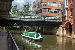 The River Wey has been used for navigation since ancient times and during the Medieval period, there is thought to have been a wharf at Millmead.[25][70] The River Wey Navigation was authorised by Act of Parliament in 1651. Twelve locks (including two flood locks), and 9 mi (14 km) of new cuts were constructed between the River Thames and Guildford, and the waterway opened in 1653.[71][72] The navigation had a positive impact on the economy of west Surrey. By the end of the 17th century, timber was being transported via the river from the county boundary with West Sussex[73] and in 1724, Daniel Defoe wrote that corn from Farnham was being sent by barge to London.[74] The Act also allowed passengers to be transported via the Wey and the maximum one-way fare was capped at 1s, which was raised in 1671 to 1s 4d.[73]