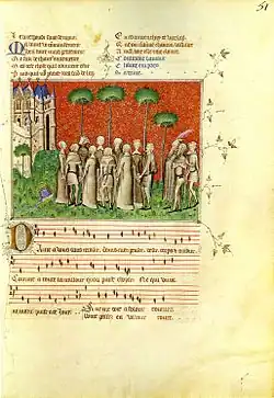 1. ^ a b Machaut died in 1377, but his exact date of death is unknown.[1] Many favor April 1377,[2][3][4] but some avoid a specific date all together.[5][6] Others are more cautious: the musicologist Elizabeth Eva Leach only notes that "Sometime before 9 November 1377, when prebend number forty passed to Johannes de Gibourty, Machaut died."[1] Without explanation, musicologist Anthony Pryer gives 13 April 1377.[7]