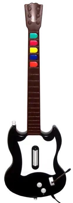 Guitar Hero was initially released to retail stores in a bundle that packaged the game disc and a Gibson SG guitar controller, priced at $69.99.[18] Since its release, stand-alone copies of the games and the guitar controller have been released, including both RedOctane[19] and third-party controllers from TAC[20] and Nyko.[21] MadCatz, another controller company that has produced guitar controllers, was set to initially be part of the game's development, creating a version of the game for the Xbox, but had to pull out due to a lawsuit by Konami; MadCatz's Darrel Richardson stated they had to pay $300,000 to get out of their contract with RedOctane.[22]