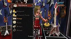 Players are able to use the Create-a-Rocker mode which is based on the Create-a-Skater mode in Neversoft's Tony Hawk series and the advanced character creation scheme from the Tiger Woods PGA Tour series. Players can change their character's poise, clothing, tattoos, makeup, and age. Selected characters from previous Guitar Hero games are available as templates for creating a rocker. Previous games featured Gibson Guitars, but as a result of a lawsuit with Gibson Guitars, branded guitars are not featured; instead, the player can create a customized guitar from various components, such as bodies, fretboards, and headstocks. The player's in-game drum set and microphone can also be similarly customized.[11] The 14 starting characters of the game can be customized too; however, their customization is limited to clothing and accessories only. Activision had formed partnerships with several instrument equipment manufactures to be featured in the game, including Ampeg, Audio-Technica, EMG Pickups, Ernie Ball, Evans Drumheads, Guitar Center, Krank Amplification, Mackie, Marshall, Orange County Drum & Percussion, Pork Pie Percussion, Regal Tip, Sabian, Vox and Zildjian.[14]