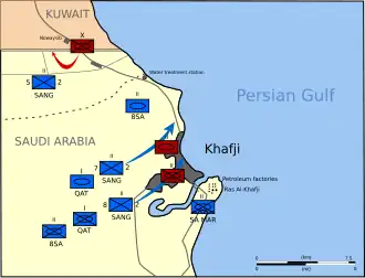 Iraqi commandos infiltrated the Kuwaiti border first to prepare for the major units, which began the attack at midnight. The Iraqi attack had two prongs, with the primary attack force driving south straight for Kuwait City down the main highway, and a supporting attack force entering Kuwait farther west, but then turning and driving east, cutting off Kuwait City from the country's southern half. The commander of a Kuwaiti armored battalion, 35th Armoured Brigade, deployed them against the Iraqi attack and conducted a robust defense at the Battle of the Bridges near Al Jahra, west of Kuwait City.[83]