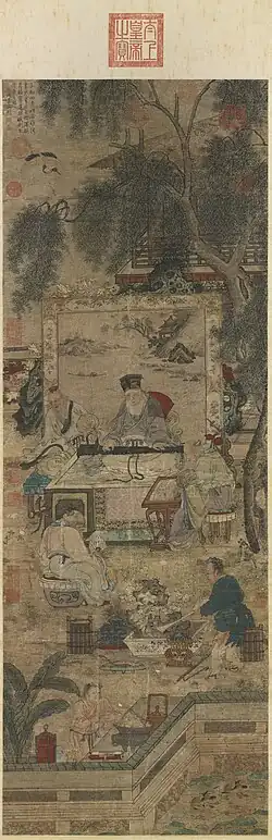 Many artists down through the ages have played the instrument, and the instrument was a favourite of scholars. Certain melodies are also associated with famous figures, such as Confucius and Qu Yuan. Some emperors of China also had a liking to the qin, including the Song dynasty emperor, Huizong, as clearly seen in his own painting of himself playing the qin in "Ting Qin Tu".[7][8]