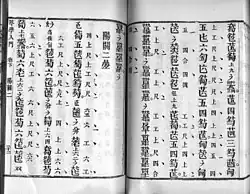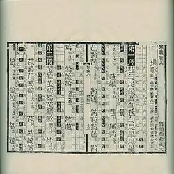 It has already been discussed that qin music has a rhythm and that it is only vaguely indicated in the tablature.[36] Though there is an amount of guesswork involved, the tablature has clues to indicate rhythm, such as repeating motifs, an indication of phrases or how the notation is arranged. Throughout the history of the qinpu, we see many attempts to indicate this rhythm more explicitly, involving devices like dots to make beats. Probably, one of the major projects to regulate the rhythm to a large scale was the compilers of the Qinxue Congshu tablature collection of the 1910s to 1930s. The construction of the written tablature was divided into two columns. The first was further divided into about three lines of a grid, each line indicating a varied combination of lyrics, gongche tablature, se tablature, pitch, and/or beats depending on the score used. The second column was devoted to qin tablature.
