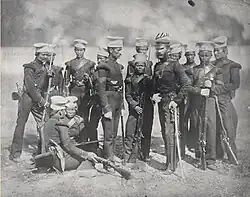 Three days after the rebellion began, the Sirmoor Battalion was ordered to move to Meerut, where the British garrison was barely holding on, and in doing so they had to march up to 48 kilometres a day.[16] Later, during the four-month Siege of Delhi, they defended Hindu Rao's house, losing 327 of 490 men. During this action they fought side by side with the 60th Rifles and a strong bond developed.[17][18]