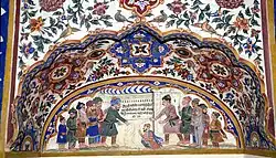 Hindus and Muslims disputing over the final rites of Guru Nanak. 19th century fresco from Gurdwara Baba Atal, Amritsar.