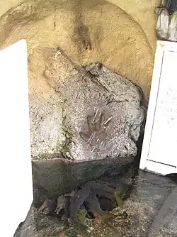 Guru Nanak's handprint is believed to be preserved on a boulder at the Gurdwara Panja Sahib in Hasan Abdal, Pakistan.