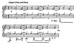 Although Holst wrote a large number of works—particularly songs—during his student days and early adulthood, almost everything he wrote before 1904 he later classified as derivative "early horrors".[4][127] Nevertheless, the composer and critic Colin Matthews recognises even in these apprentice works an "instinctive orchestral flair".[4] Of the few pieces from this period which demonstrate some originality, Matthews pinpoints the G minor String Trio of 1894 (unperformed until 1974) as the first underivative work produced by Holst.[128] Matthews and Imogen Holst each highlight the "Elegy" movement in The Cotswold Symphony (1899–1900) as among the more accomplished of the apprentice works, and Imogen discerns glimpses of her father's real self in the 1899 Suite de ballet and the Ave Maria of 1900. She and Matthews have asserted that Holst found his genuine voice in his setting of Whitman's verses, The Mystic Trumpeter (1904), in which the trumpet calls that characterise Mars in The Planets are briefly anticipated.[4][127] In this work, Holst first employs the technique of bitonality—the use of two keys simultaneously.[9]