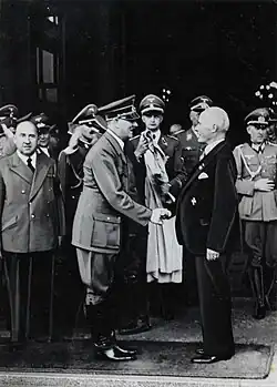 Gustav Krupp receives the Golden Party Badge of the NSDAP from Adolf Hitler in the German city of Essen, 1940