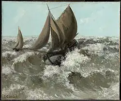 While Courbet's seascapes, painted during his many visits to the northern coast of France in the late 1860s, were decidedly less controversial than his salon submissions, they furthered his contributions (willing or otherwise) to realism with their emphasis on both the beauty and danger of the natural world. There is a distinct range in the tones of this period with The Calm Sea (1869) depicting the serenity of the receded tide, and The Sailboat (c. 1869) showing a sailboat wrestling with violent tides.[30]