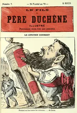 On 12 April, the executive committee of the Commune gave Courbet, though he was not yet officially a member of the Commune, the assignment of opening the museums and organizing the Salon. They issued the following decree at the same meeting: "The Column of the Place Vendôme will be demolished."[43] On 16 April, special elections were held to replace more moderate members of the Commune who had resigned their seats, and Courbet was elected as a delegate for the 6th arrondissement of Paris. He was given the title of Delegate of Fine Arts, and on 21 April he was also made a member of the Commission on Education. At the meeting of the commission on 27 April, the minutes reported that Courbet requested the demolition of the Vendôme column be carried out and that the column would be replaced by an allegorical figure representing the taking of power of the Commune on 18 March.[43]