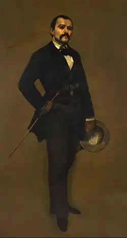 Courbet became a celebrity and was spoken of as a genius, a "terrible socialist" and a "savage".[22] He actively encouraged the public's perception of him as an unschooled peasant, while his ambition, his bold pronouncements to journalists, and his insistence on depicting his own life in his art gave him a reputation for unbridled vanity.[23]