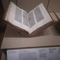 The Gutenberg Bible is an edition of the Latin Vulgate printed in the 1450s by Johannes Gutenberg in Mainz (Holy Roman Empire), in present-day Germany. Out of either 158 or 180 copies that were originally printed, 49 survive in at least substantial portion, 21 of them in entirety; of these, the copy with the earliest visible print date is marked as 15 August 1456.[2] They are thought to be among the world's most valuable books, although no complete copy has been sold since 1978.[3][4] In March 1455, the future Pope Pius II wrote that he had seen pages from the Gutenberg Bible, displayed in Frankfurt to promote the edition.