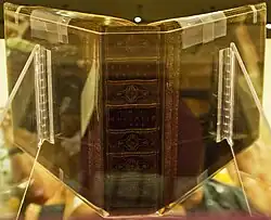 Although many Gutenberg Bibles have been rebound over the years, nine copies retain fifteenth-century bindings. Most of these copies were bound in either Mainz or Erfurt.[37] Most copies were divided into two volumes, the first volume ending with The Book of Psalms. Copies on vellum were heavier and for this reason were sometimes bound in three or four volumes.[1]