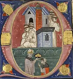 However, before she was crowned, Sibylla agreed with oppositional court members that she would annul her marriage with Guy to please them, as long as she was given free choice in her next husband and her children with Guy were declared legitimate.[57] The leaders of the High Court agreed, and Sibylla was crowned queen regnant. After crowning her, the patriarch gave Sibylla a second crown and asked her to choose a new husband. She shocked the attendees by choosing to remarry Guy, who was unpopular even among her supporters,[58][59] and crowning him.[57] However, there is no mention of Sibylla and Guy being anointed, which was expected at the time.[60]