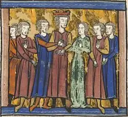 During the Holy Week in 1180, Raymond III of Tripoli and Bohemond III of Antioch, two of the most powerful men in the kingdom, were preparing to invade Jerusalem.[14] The historian Bernard Hamilton believed that they wished to force King Baldwin to have his sister, Sibylla, marry Baldwin of Ibelin, Aimery of Lusignan's father-in-law, and then to abdicate. They would therefore remove the king's mother, Agnes, from power and promote a local noble to the throne instead of a foreigner.[15] Guy and Sibylla were hastily married at Eastertide to prevent this coup.[16] The ceremony was noticeably hurried; the wedding was canonically invalid and there was no public notice.[17]