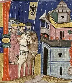 Meanwhile, Guy and Sibylla hurried to Jerusalem to attend her son's funeral.[49][52] Heraclius, the patriarch of Jerusalem, the grand masters of the Templars and Hospitallers, and Raynald of Châtillon were also present. They decided to offer Sibylla the crown without waiting for the decision of the western monarchs.[55] Sibylla announced that the kingdom had passed to her by hereditary right,[49] but the nobles at Nablus did not acknowledge her queenship, claiming that crowning Sibylla would breach their oaths taken at Baldwin IV's deathbed.[49] They forbade the coronation and sent two abbots to Jerusalem to tell her of their veto.[56][57] The city gates were consequently barred before the ceremony to prevent interruption by Raymond's men. Sibylla was then acclaimed queen by the citizens of Jerusalem at Raynald's request.[49]