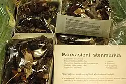 Selling and purchasing fresh false morels is legal in Finland, where it is highly regarded.[73] However, the mushrooms are required by law to be accompanied with a warning that they are poisonous and legally prescribed preparation instructions.[74] False morels are also sold prepared and canned, in which case they are ready to be used. Official figures from the Finnish Ministry of Agriculture and Forestry report a total amount of false morels sold in Finland of 21.9 tonnes in 2006 and 32.7 tonnes, noted as being above average, in 2007.[75] In 2002, the Finnish Food Safety Authority estimated annual consumption of false morels to be hundreds of tonnes in plentiful years.[76] In Finnish cuisine, false morels may be cooked in an omelette, or gently sautéed in butter in a saucepan, flour and milk added to make a béchamel sauce, or pie filling. Alternatively, more fluid can be added for a false morel soup. Typical condiments added for flavour include parsley, chives, dill and black pepper.[77][78]