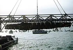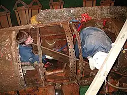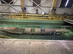 The in situ underwater archaeological investigation and excavation culminated with the raising of Hunley on 8 August 2000.[48] A large team of professionals from the Naval Historical Center's Underwater Archaeology Branch, National Park Service, the South Carolina Institute of Archaeology and Anthropology, and various other individuals investigated the vessel, measuring and documenting her before removal. Once the on-site investigation was complete, harnesses were slipped underneath the sub and attached to a truss designed by Oceaneering International. After the last harness had been secured, the crane from the recovery barge Karlissa B hoisted the submarine from the sea floor.[49][50] She was raised from the open waters of the Atlantic Ocean, just over 3.5 nautical miles (6.5 km) from Sullivan's Island outside the entrance to Charleston Harbor. Despite having used a sextant and hand-held compass thirty years earlier to plot the wreck's location, Dr. Spence's 52 m (171 ft) accuracy turned out to be well within the length of the recovery barge, which was 64 m (210 ft) long.[51][52] On 8 August 2000, at 08:37, the sub broke the surface for the first time in more than 136 years, greeted by a cheering crowd on shore and in surrounding watercraft, including author Clive Cussler. Once safely on her transporting barge, Hunley was shipped back to Charleston. The removal operation concluded when the submarine was secured inside the Warren Lasch Conservation Center, at the former Charleston Navy Yard in North Charleston, in a specially designed tank of fresh water to await conservation until she could eventually be exposed to air.
