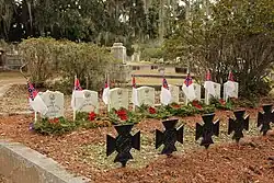 On 17 April 2004, the remains of the crew were laid to rest at Magnolia Cemetery, in Charleston.[62] Tens of thousands of people attended including some 6,000 reenactors and 4,000 civilians wearing period clothing. Color guards from all five branches of the U.S. armed forces—wearing modern uniforms—were also in the procession.[63] Even though only two of the crew were from the Confederate States, all were buried with full Confederate honors, including being buried with the 2nd Confederate national flag,[64] known as the Stainless Banner.