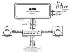 ARC (Audio Return Channel) is an audio link introduced in 2009 with the HDMI 1.4 standard meant to replace other cables between the TV and the A/V receiver or speaker system.[36] This direction is used when the TV is the one that generates or receives the video stream instead of the other equipment.[36] A typical case is the running of an app on a smart TV such as Netflix, but reproduction of audio is handled by the other equipment.[36] Without ARC, the audio output from the TV must be routed by another cable, typically TOSLink or RCA, into the speaker system.[47] ARC supports stereo PCM and compressed codecs Dolby Digital, Dolby Digital Plus and DTS up to 5.1 channels, with Dolby Atmos metadata in Dolby codecs.[48]