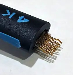This Mini connector is smaller than the type A plug, measuring 10.42 mm × 2.42 mm but has the same 19-pin configuration.[32]: §§4.1.9.4,4.1.9.6 It is intended for portable devices.[2][32]: §4.1.1 [60] The differences are that all positive signals of the differential pairs are swapped with their corresponding shield, the DDC/CEC Ground is assigned to pin 13 instead of pin 17, the CEC is assigned to pin 14 instead of pin 13, and the reserved pin is 17 instead of pin 14.[32]: §4.1.10.5 The type C Mini connector can be connected to a type A connector using a type A-to-type C cable.[32]: §4.1.1 [60]