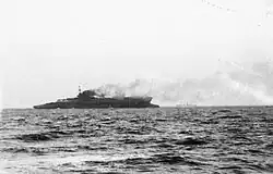 Upon commissioning, Courageous was assigned to the 3rd Light Cruiser Squadron of the Grand Fleet. She became flagship of the 1st Cruiser Squadron near the end of 1916 when that unit was re-formed after most of its ships had been sunk at the Battle of Jutland in May.[11] The ship was temporarily fitted as a minelayer in April 1917 by the addition of mine rails on her quarterdeck that could hold over 200 mines, but never laid any mines. In mid-1917, she received half a dozen torpedo mounts, each with two tubes: one mount on each side of the mainmast on the upper deck and two mounts on each side of the rear turret on the quarterdeck.[12][13] On 30 July 1917, Rear-Admiral Trevylyan Napier assumed command of the 1st Cruiser Squadron and was appointed Acting Vice-Admiral Commanding the Light Cruiser Force until he was relieved on 26 October 1918.[14]
