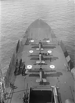 Furious was assigned to the Atlantic Fleet after commissioning in 1925, although she spent much of the next several years conducting trials for practically every aircraft in the Fleet Air Arm (FAA) inventory. These included landing and flying-off tests of Fairey IIID and Fairey Flycatcher floatplanes, with and without wheels, to compare various designs of wooden and metal floats. The lower flight deck was greased to allow them to take off with a minimum of difficulty. A Flycatcher fitted with wooden skids was also tested and behaved perfectly satisfactorily.[32][35] The arresting gear was barely used during these trials and it was removed shortly afterwards. Deck-edge palisades were installed in 1927 to keep aircraft from blowing over the side in rough weather.[22][36] The first carrier night-landing was made by a Blackburn Dart on 6 May 1926 aboard Furious.[37] In the 1920s, the ship commonly carried one flight of fighters (Fairey Flycatcher), two of spotters (Blackburn Blackburn or Avro Bison), one spotter reconnaissance (Fairey IIID) and two flights of torpedo bombers (Blackburn Dart), each usually of six aircraft.[24]