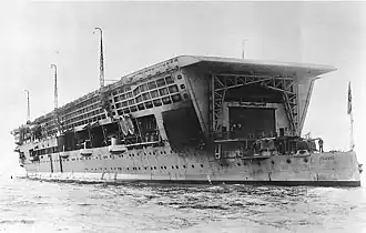 The ship's superstructure, masts, funnel and landing deck were removed and she was given a 576-by-92-foot (175.6 by 28.0 m) flight deck that extended over three-quarters of her length. This flight deck was not level; it sloped upwards about three-quarters of the way from the stern to help slow down landing aircraft, which had no brakes at that time. The fore-and-aft 320-foot (97.5 m) arresting gear was not intended to stop landing aircraft—the landing speeds of the time were low enough that this was unnecessary given a good headwind—but rather to prevent aircraft from veering off to one side and potentially falling off the flight deck.[22] Various designs for the flight deck were tested in a wind tunnel by the National Physical Laboratory which showed that the distinctive elliptical shape and rounded edges used minimised turbulence.[23]