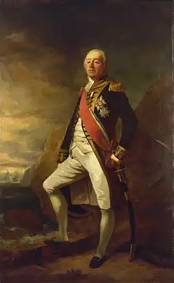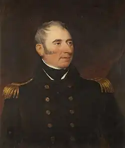 On 18 March, Saumarez raised his flag on Victory, sailing for the Nore on 1 April. There, on 16 April, he received his final orders before leaving for the Baltic on 30 April in the company of two gun brigs.[128] Victory eventually arrived at Gothenburg on 9 May having been further delayed by the weather.[129] During the evening of 29 June, while Victory was anchored off the city, Saumarez hosted a ball for a few of its citizens. During the event, Moore arrived aboard, having escaped from captivity four days previous.[130] The following morning, Victory withdrew to Vinga where Saumarez' main force was kept, and Moore transferred to the 74-gun HMS Audacious which was due to escort a convoy to Yarmouth.[131] After arriving in England, Moore was sent to Portugal in July, where he took command of the British forces there.[132] After Moore's escape, Saumarez was freed of the need to remain in the Lieutenant-General's vicinity. Hitherto having only been able to send small squadrons under Hood or Keats, he was now able to move the bulk of his fleet into the Baltic Sea where he could aid the Swedes fighting in Finland and bring the Russian fleet to action if the chance occurred.[133] Victory's progress was slow, the winds were unfavourable and extra care had to be taken manoeuvring such a large ship in shallow waters. She eventually made the Danish island of Mon on 25 July where she rendevouzed with Hood's ships.[134] Saumarez had a large subsidy on board that the British government had promised to the Swedish king, and on 31 July, sailed on to Stockholm.[135]