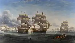 In October 1782, Victory was the flagship of Admiral Richard Howe who had been charged with providing a powerful escort for a convoy of transports carrying supplies to Gibraltar.[50] When Victory reached Cape St Vincent on 8 October, Howe had one of his frigates sail ahead. She returned on 10 October and reported that Gibraltar was still in British hands, having survived an attack the previous month.[51] A storm broke out that night which continued into the next morning. As the convoy approached its destination, Howe had his ships-of-the-line arranged in two columns with Victory leading but the blockading fleet did not come out to meet them and instead remained riding the storm out at anchor.[51] Despite Howe's warnings and guidance on how to negotiate the problematic currents, only four of the convoy managed to enter the harbour with the remainder being carried past.[52] On 14 October, fifty ships-of-the-line from the Franco-Spanish fleet began making ready for sea but a change in the wind direction the next day ensured they could not interfere and Howe was able to get the rest of the convoy into harbour.[53]