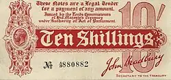 During the First World War, the Treasury attempted to stabilise finances. It closed the Stock Exchange, paused many payments, and issued new paper money like the Bradbury note.[44] Ideologically, the Treasury shifted from Gladstonian prudence to Keynesian management of jobs and prices.[45]