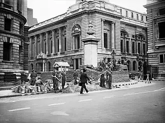 Troops from the Grenadier Guards constructing sandbag defences around the Treasury.
