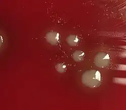 Colonies of H. influenzae appear as convex, smooth, pale, grey, or transparent colonies with a mild odor.[34] H. influenzae will only grow on blood agar if other bacteria are present to release these factors from the red blood cells, forming 'satellite' colonies around these bacteria. For example, H. influenzae will grow in the hemolytic zone of Staphylococcus aureus on blood agar plates; the hemolysis of cells by S. aureus releases NAD which is needed for its growth. H. influenzae will not grow outside the hemolytic zone of S. aureus due to the lack of nutrients in these areas.[35]